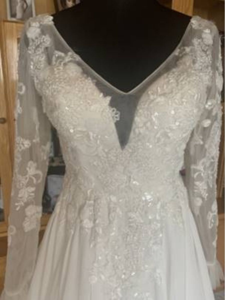 This beautiful Long Sleeve Lace and Chiffon Ivory Wedding has a low V-Neck with nett detail with sequin embellishments.