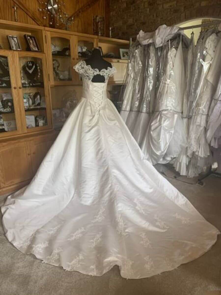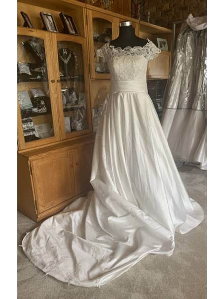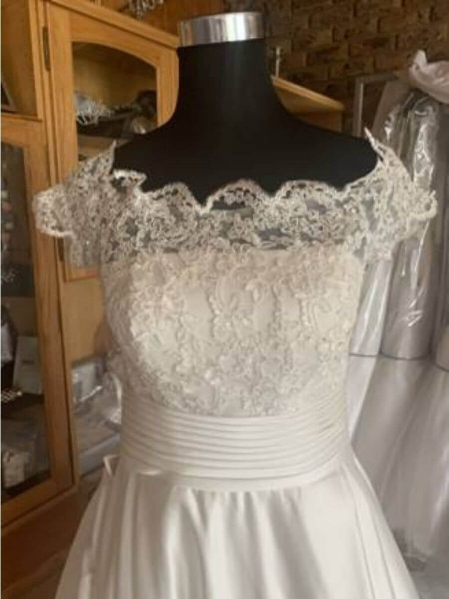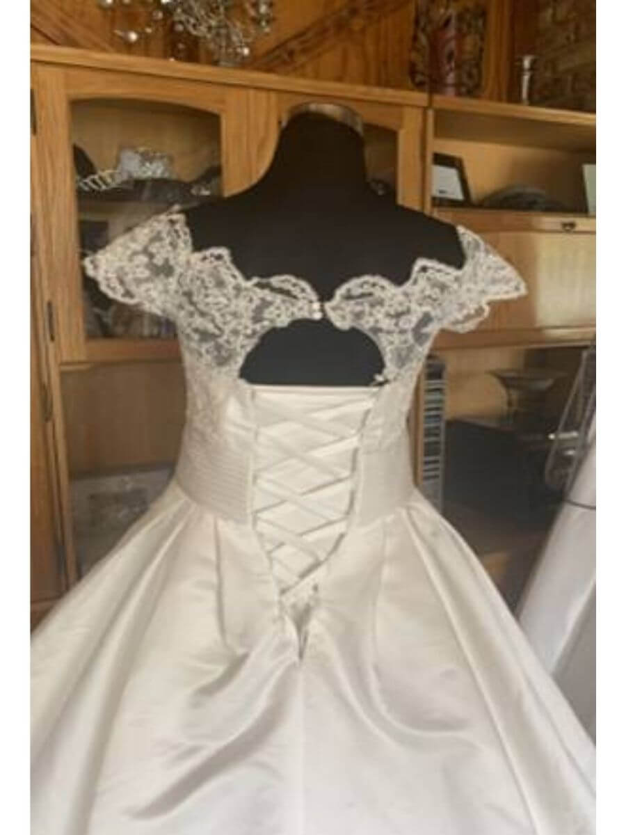 This Unique Satin Ivory Wedding Gown with a lace bodice has a classic flair.