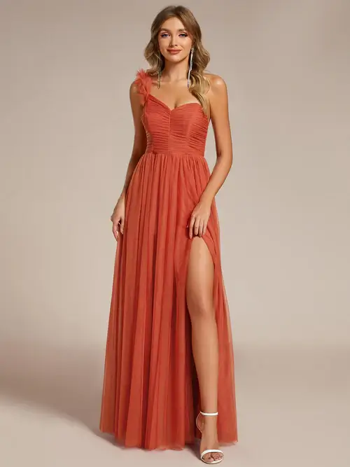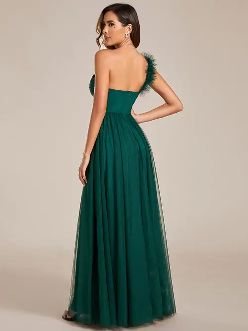 EY1911-EP One Shoulder Pleated Tulle Evening Gown with Slit