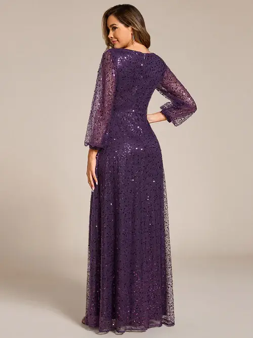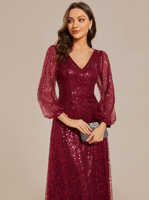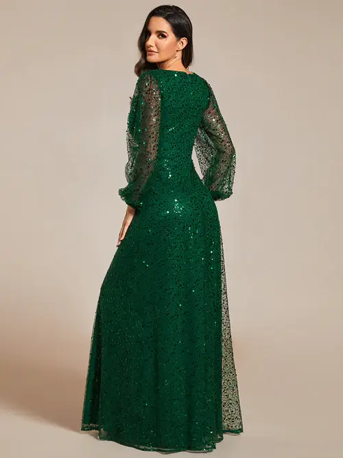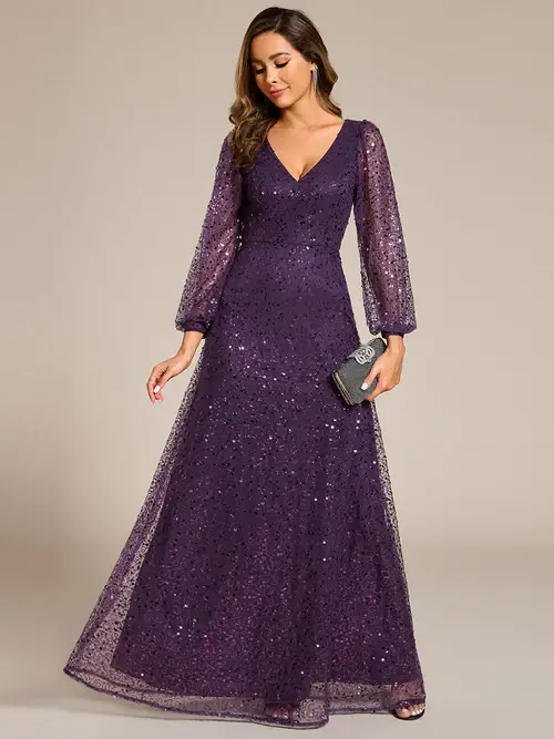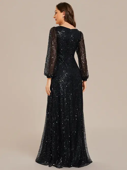 This stunning glitter evening gown features a-line silhouette and has long sleeves which is perfect for a chilly evening funtion.