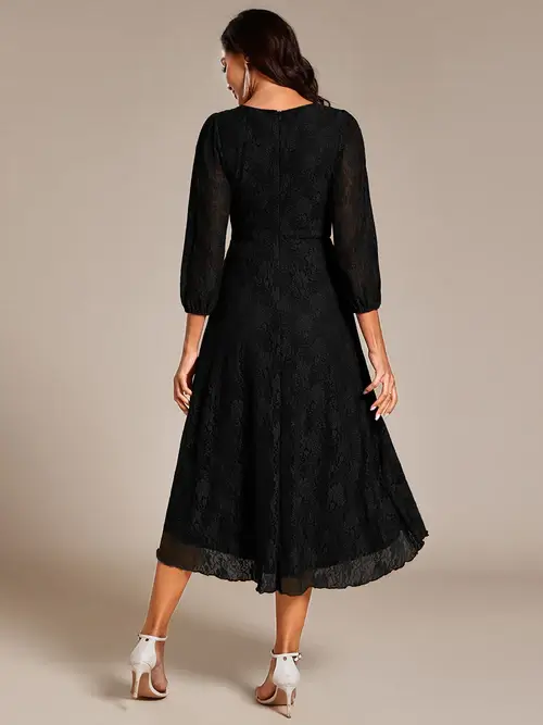 This exquisite dress boasts long lantern sleeves and a regular fitted silhouette. The asymmetric hem adds a touch of grace and timeless elegance. Perfect for any formal occasion, it flatters every curve..