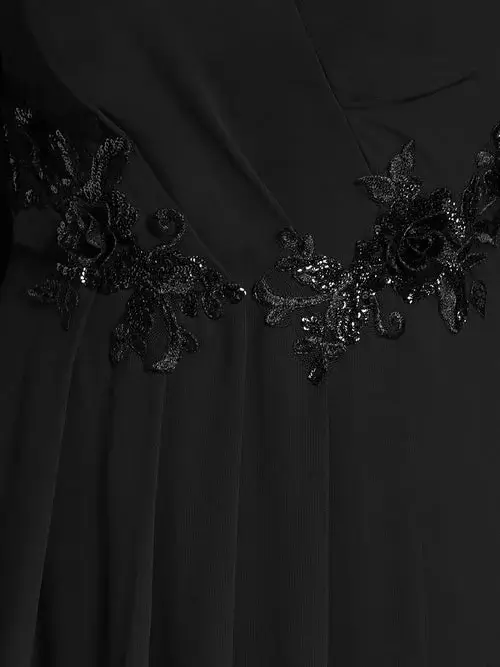 Elegantly crafted, this midi-length chiffon evening dress boasts lantern sleeves and an appliqu¨¦d empire waistline for a touch of vintage charm. The asymmetrical hem adds a modern twist, enhancing its graceful silhouette. The lightweight fabric flows effortlessly, making it the perfect choice for a special occasion where you want to make a statement.