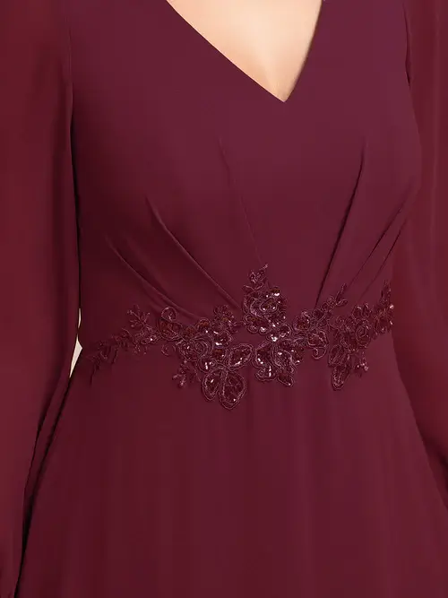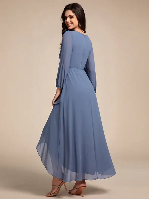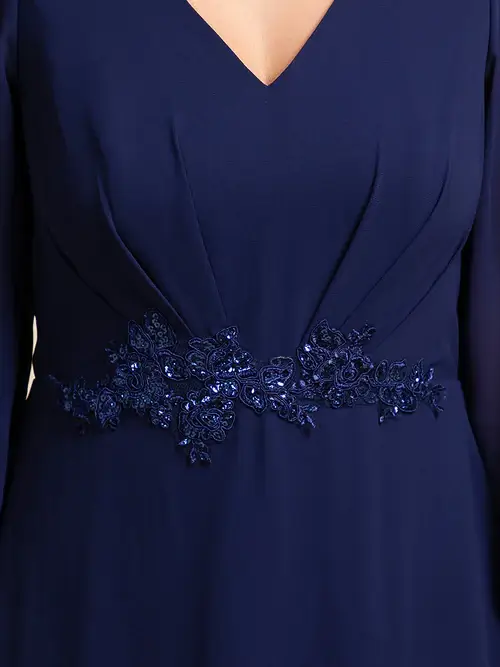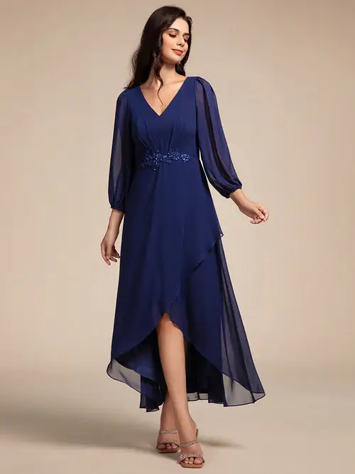Embody timeless elegance in this exquisite chiffon evening dress, featuring an appliqued empire waistline that flatters every figure. Its fluid silhouette gracefully flows to an asymmetrical hem, creating a captivating dance of fabric that whispers sophistication. Perfect for any special occasion, this dress is a showstopper.