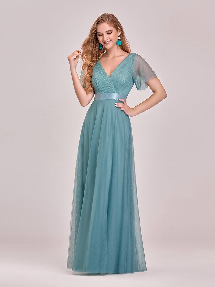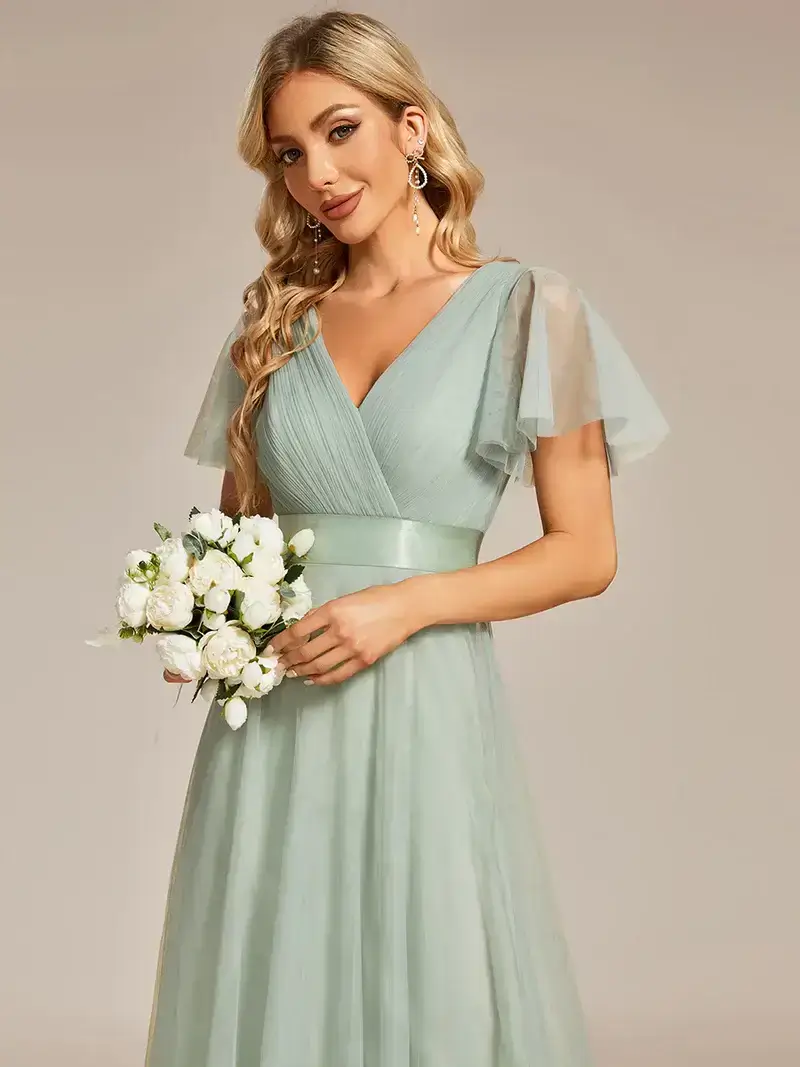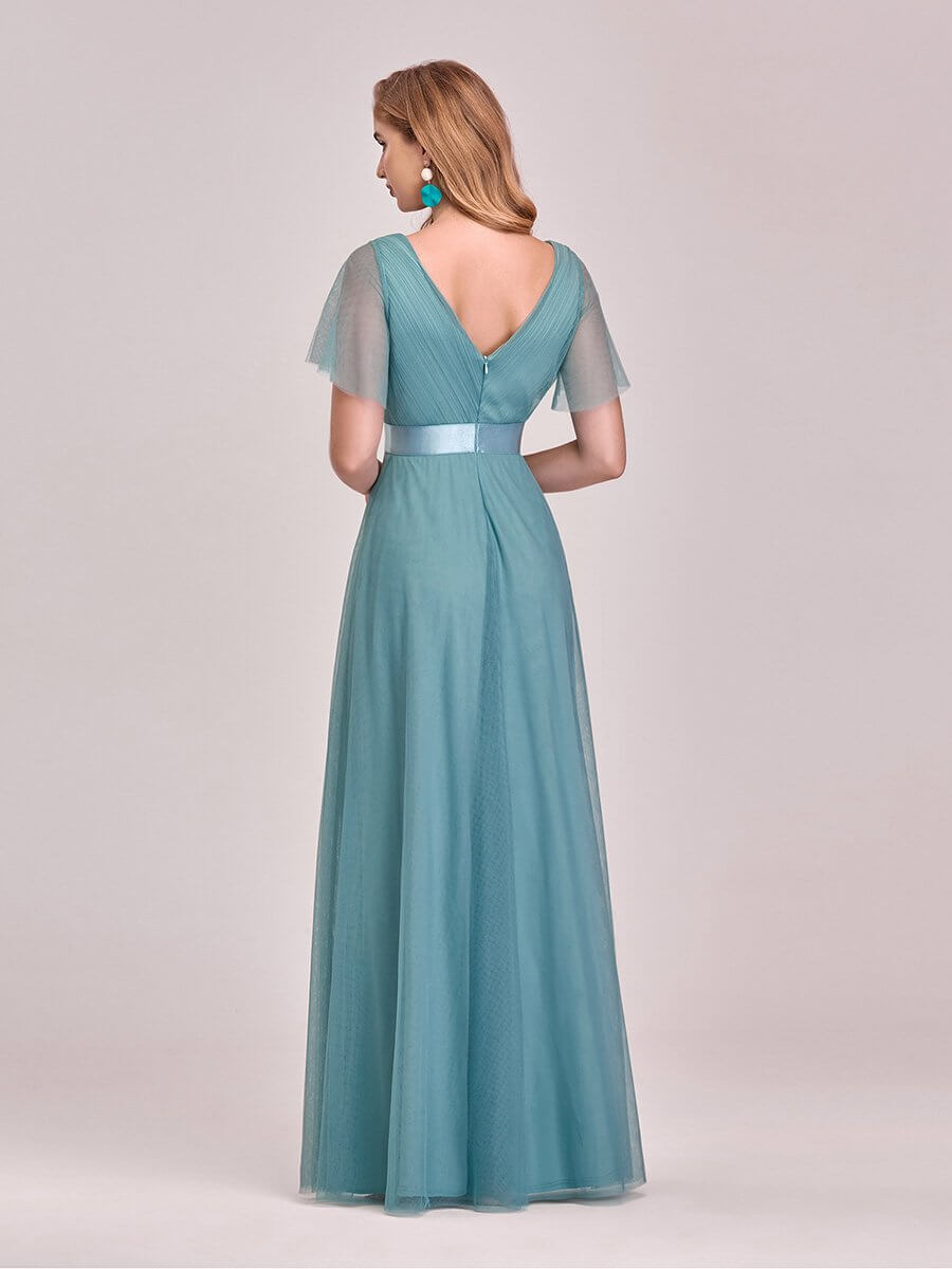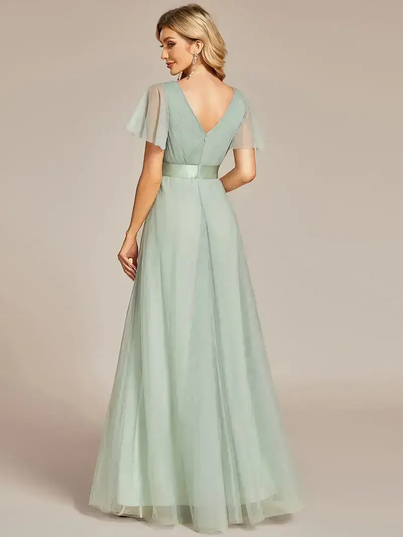 This romantic evening gown features a deep V neckline, empire waist flutter sleeves and subtle high low tulle hemline. It is flattering to most body types. We think this elegant evening gown is perfect for all formal occasions from evening party, cocktail, weddings to matric farewell and graduation!