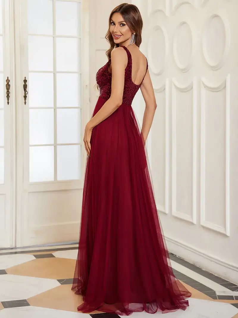 This striking evening gown is sleeveless, has a U-neckline and A-line silhouette. The bodice is sequinced and the skirt flows with soft tulle. Suitable for any the evening, party, matric farewell, graduation, weddings and any other formal affair!