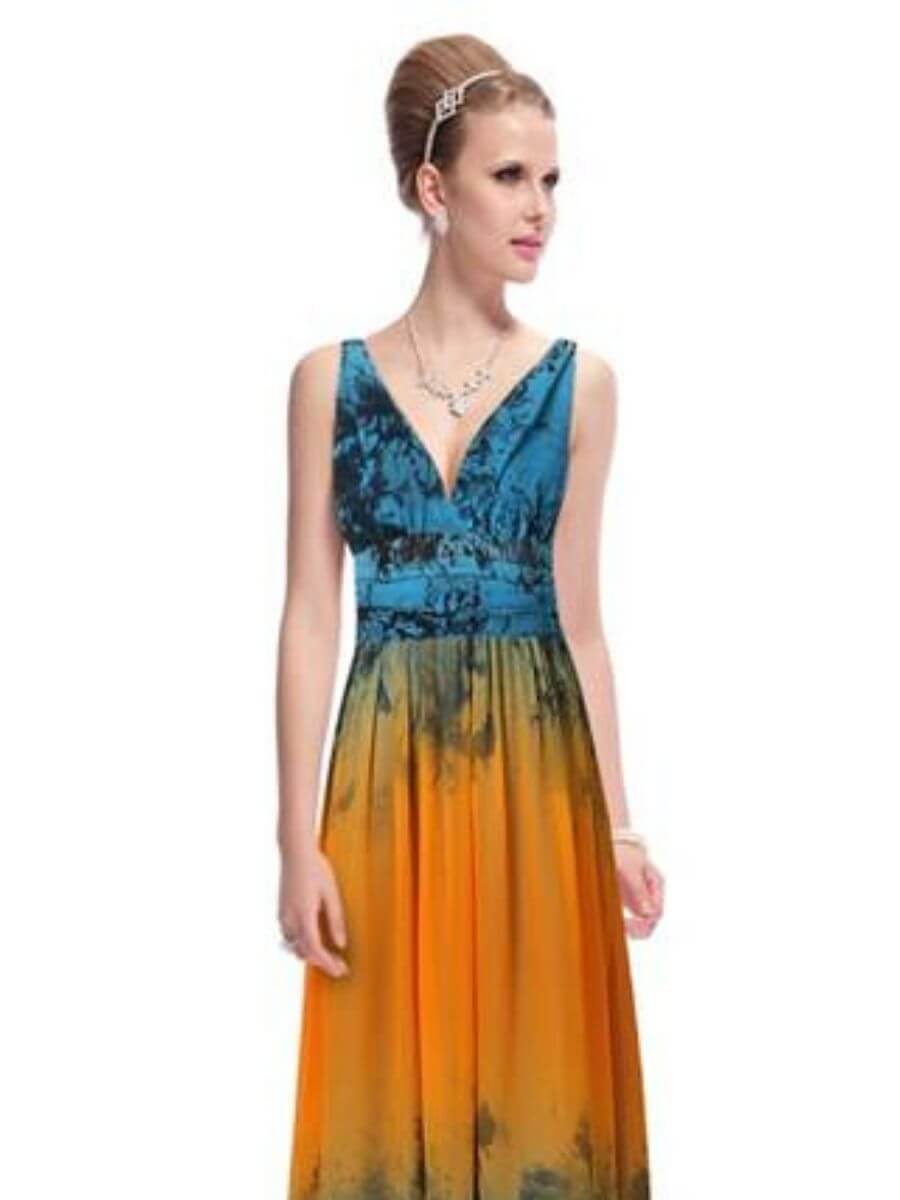 Love Blue and Orange. This is your dress. Stunning V Neck design in beautiful pattern print.