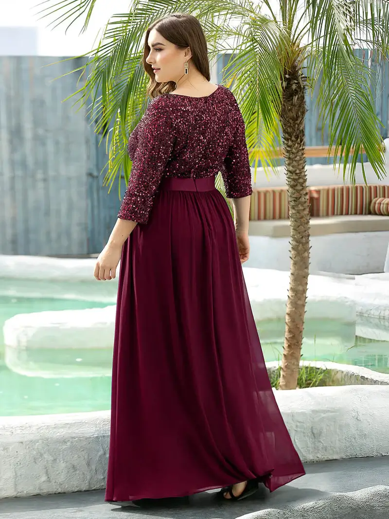 This sparkling evening gown features a classic round neckline, half sleeves and a flowy A-line skirt. The ribbon in the waist helps to define your curve! We think this stunning evening dress is perfect for evening party, cocktail, graduation, weddings and any other formal affair!